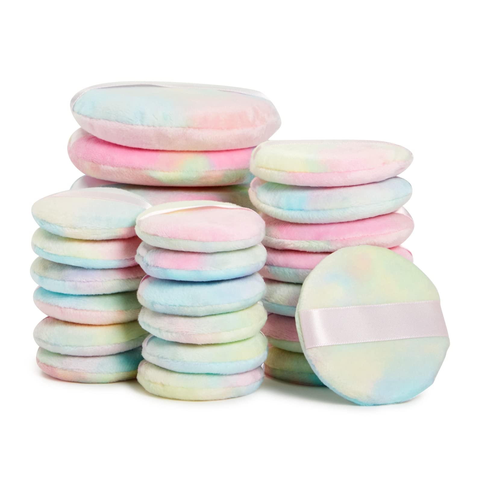 Details: Quickly apply and touch up your makeup on the go with our set of 24 makeup powder puffs that feature cute tie-dye colors like pink, blue, and green. The reusable puff powder applicator pack includes 3 sizes that measure between 2.25 inches to 4 inches; they come stacked in a plastic storage container for convenient storage and accessibility. Use the large powder applicator on your body, the medium on your chest and neck, and the small on your face to flawlessly apply setting powder. The soft sponge will contour to your T-zone and under your eyes, ideal for applying loose powder, concealer, compact, foundation, blush, and highlight.