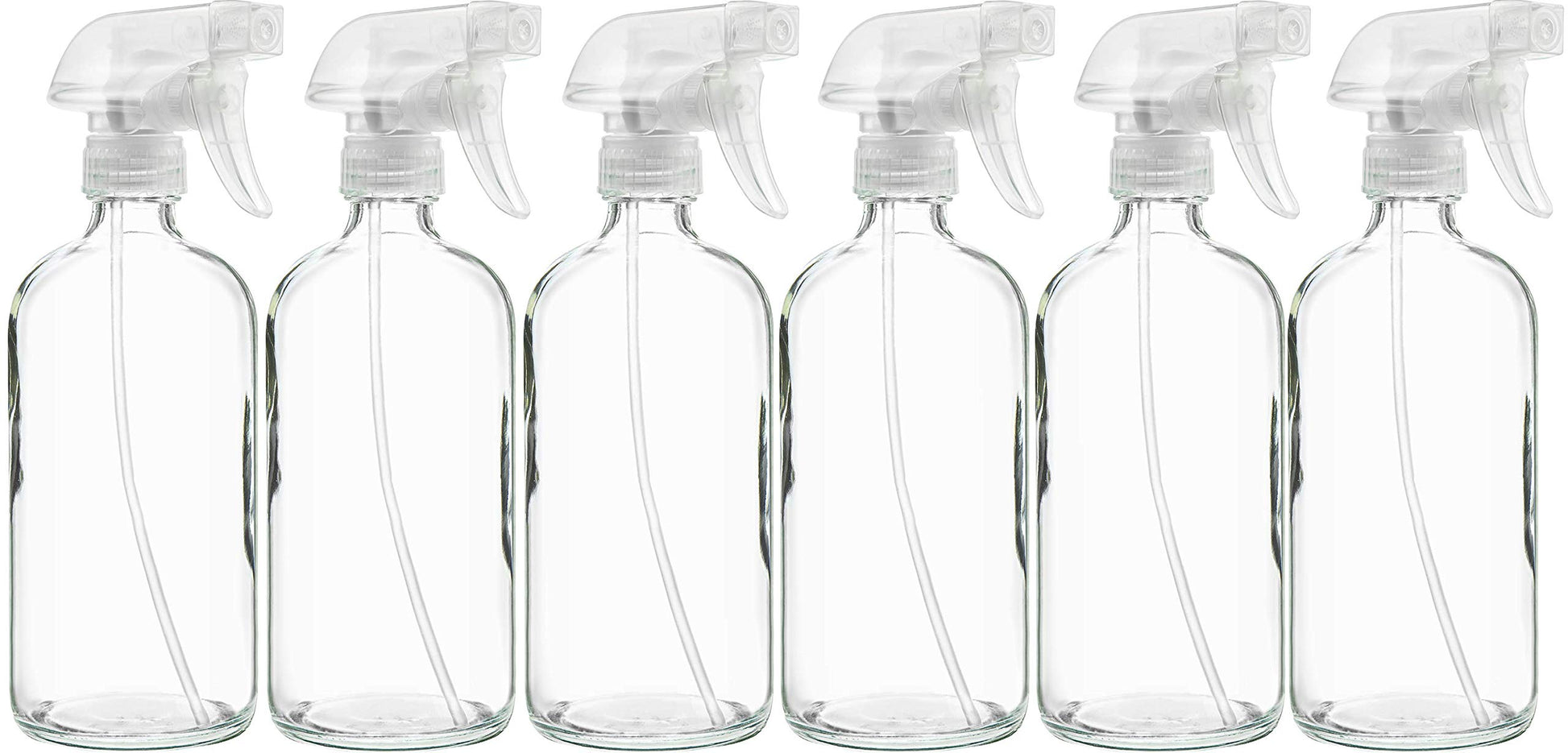 6 Pack of 16 oz Refillable Clear Glass Spray Bottles - Reusable Containers with Adjustable Sprayer: Misting & Stream - For Essential Oils, Cosmetics, Cleaning Products, Plants, Cooking, Aromatherapy