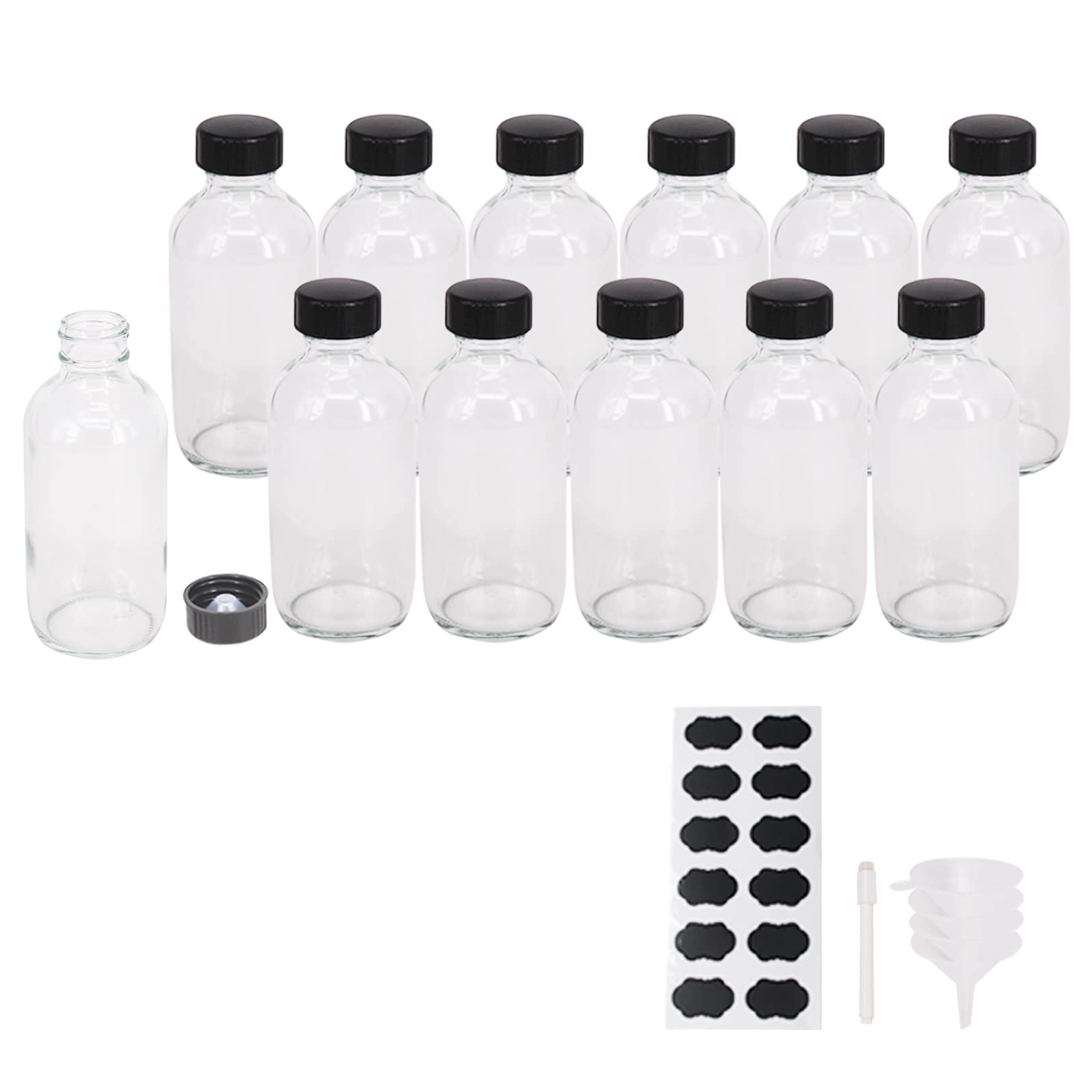 - Package: 12 pack 4 oz clear Boston round glass bottle with cap, 4 funnel, 12 chalk label, 1 pen.