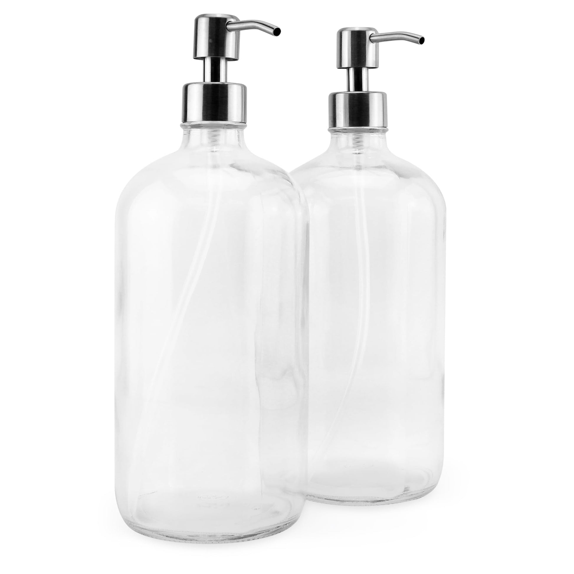 Cornucopia 32oz Glass Pump Bottles with Stainless Steel Pump (2-Pack, Clear); Economy Size Soap Dispenser for Massage Oils, Lotions, Liquid Soaps