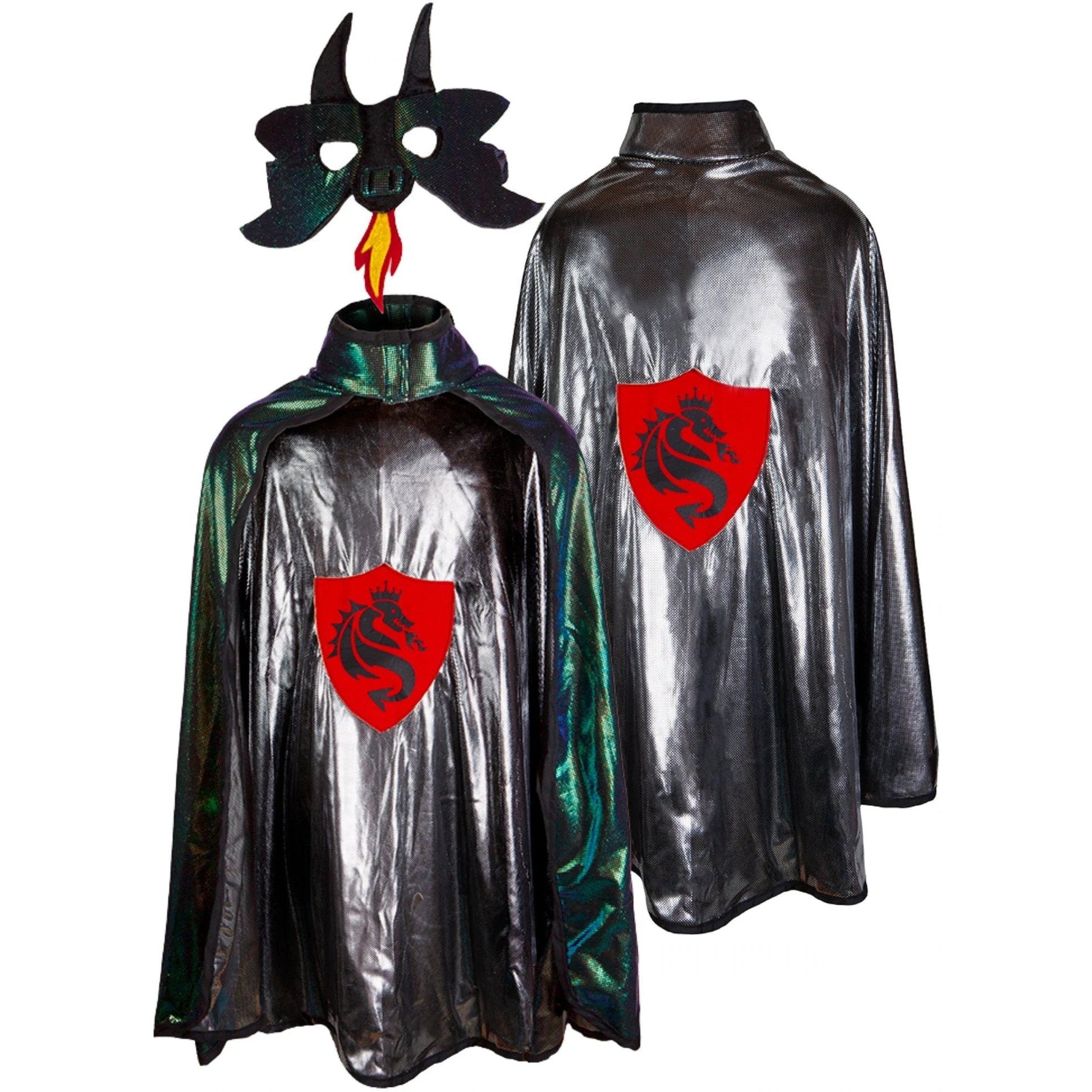 his magnificent 2-piece Reversible Dragon Knight Cape with a Mask looks like liquid metal! It’s made with beautiful quality fabric that feels very silky and features iridescent metallic foil print on one side and silver/black foil print on the other. There are red felt spikes on the dragon side and a red shield emblem on the knight side. The double-layer mask has velvet, red and yellow felt flames coming from the mouth for a super cool effect, and felt back for reinforcement. This cape is a really great design with its armor effect on one side and a fiery dragon on the reversed side. It’s machine washable and very easy for on and off with its Velcro fastener.