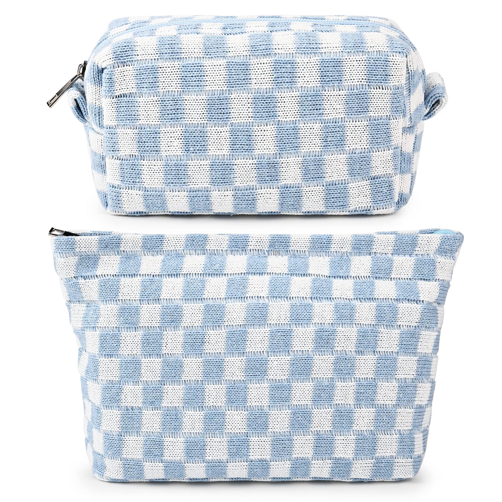 SOIDRAM 2 Pieces Makeup Bag Large Checkered Cosmetic Bag Blue Capacity Canvas Travel Toiletry Bag Organizer Cute Makeup Brushes Aesthetic Accessories Storage Bag for Women