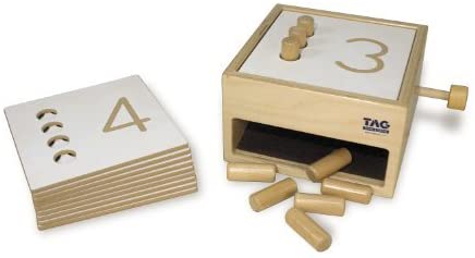 Teaches counting in a concrete, active and enjoyable way. Interchangeable number plates fit into the top. The child places pegs into the holes next to the number while counting aloud, then pulls the knob and the pegs come tumbling down.
